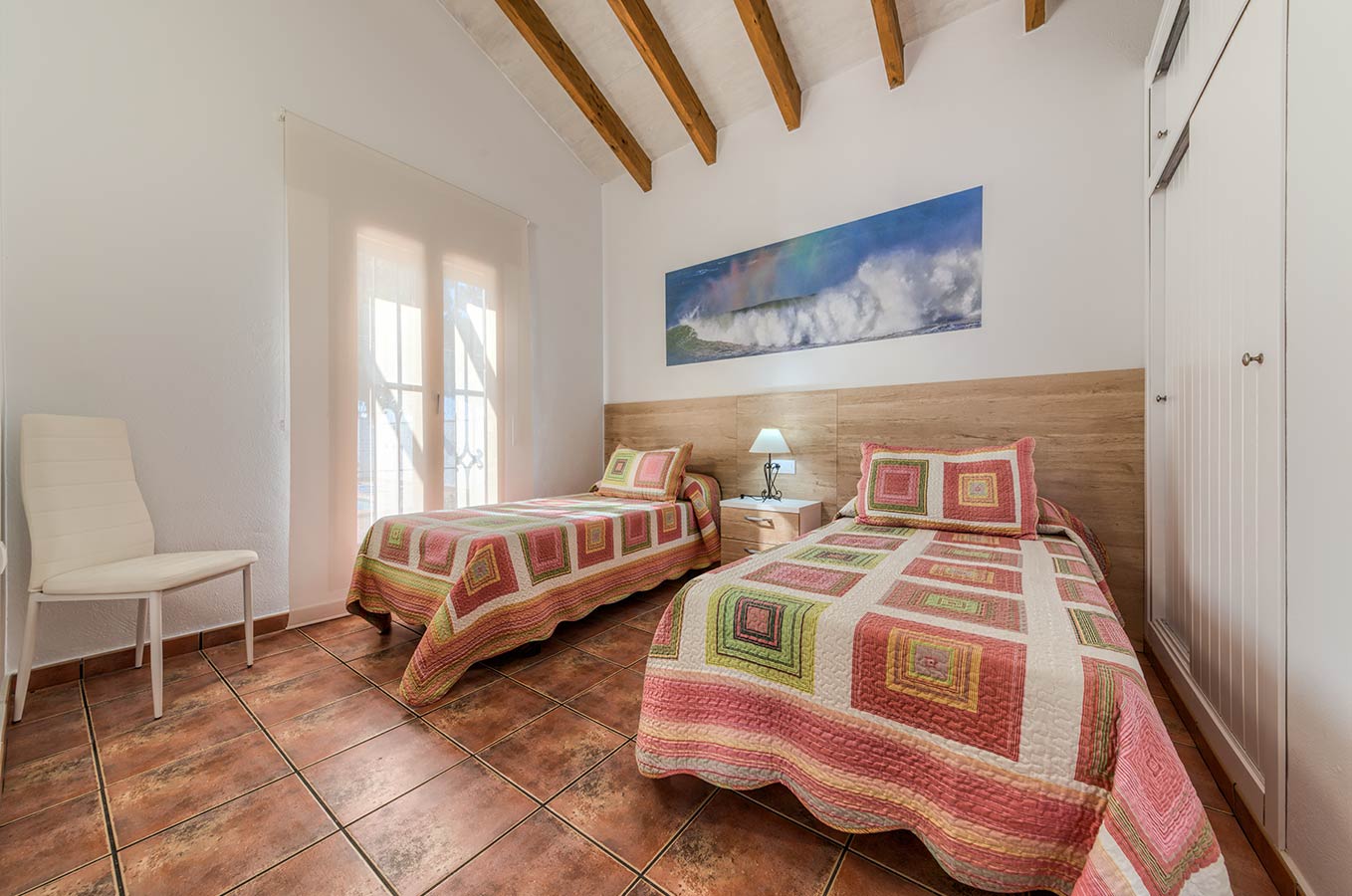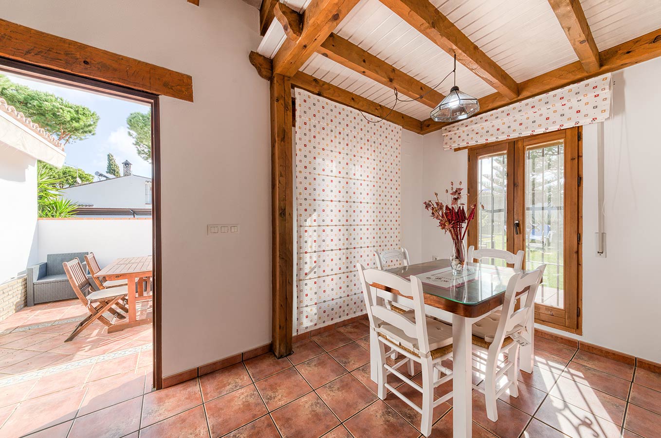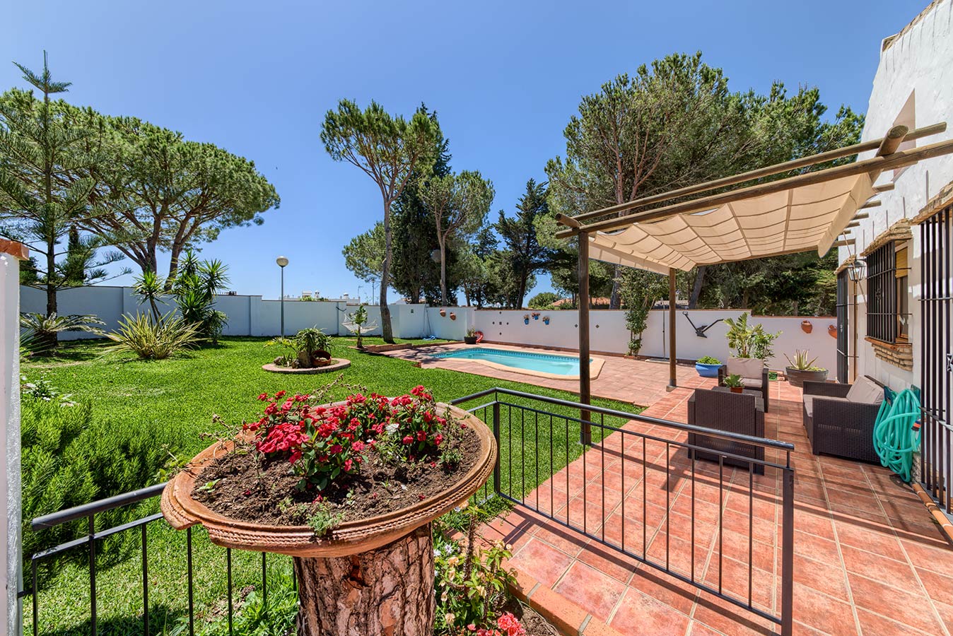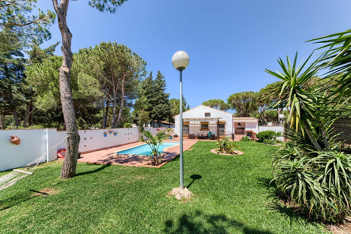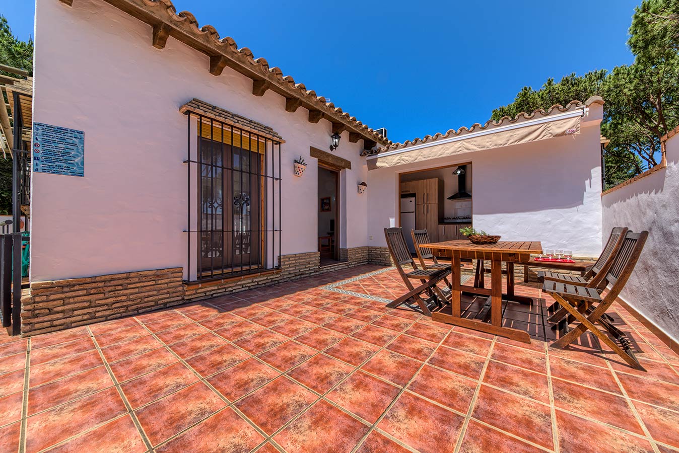 Esta casa cercada independiente forma parte de un conjunto de 5 casas en alquiler dentro de una parcela de 4.500 m2 de pinares, localizadas en la Fuente del Gallo a 2,5 kilómetros del pueblo y a tan sólo 800 metros de la playa y acantilados.