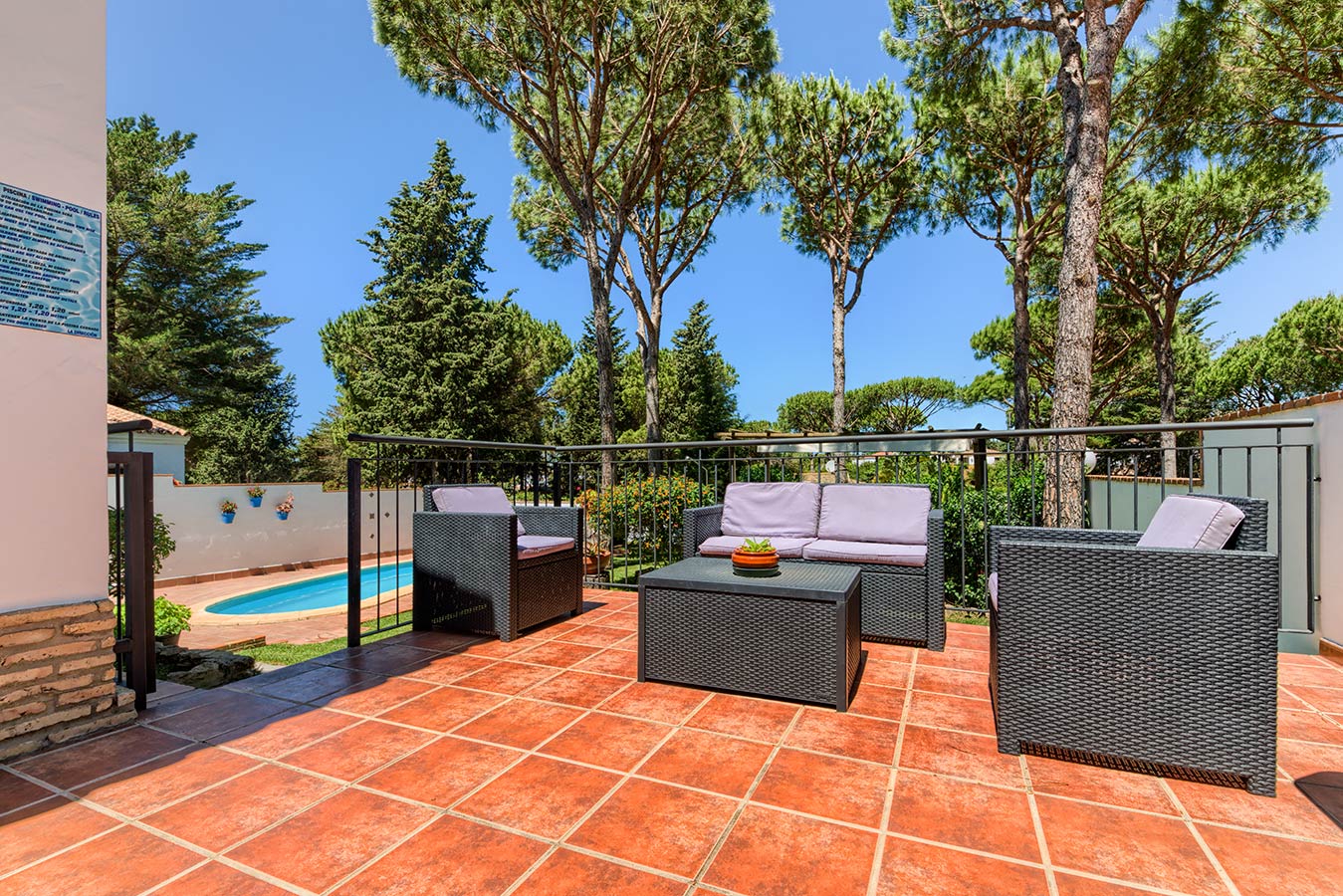 Esta casa cercada independiente forma parte de un conjunto de 5 casas en alquiler dentro de una parcela de 4.500 m2 de pinares, localizadas en la Fuente del Gallo a 2,5 kilómetros del pueblo y a tan sólo 800 metros de la playa y acantilados.